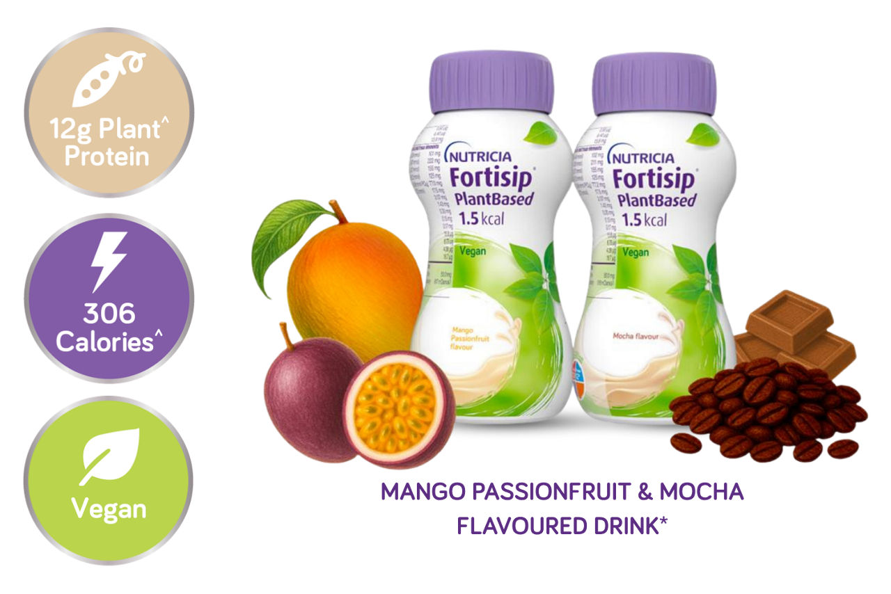 Speak to your healthcare professional to see if Fortisip® is right for you. Fortisip® is a Food for Special Medical Purposes for the dietary management of disease related malnutrition and must be used under medical supervision. ^per 200 mL. * Does not contain real fruit. Uses mango, passionfruit, and mocha flavourings.